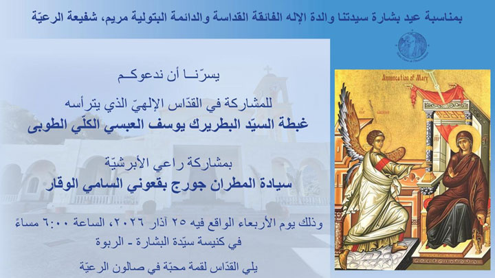 بمناسبة عيد بشارة سيّدتنا والدة الإله الفائقة القداسة والدّائمة البتوليّة مريم، شفيعة رعيّة سيّدة البشارة- الرّبوة، يترأّس بطريرك أنطاكية وسائر المشرق للرّوم الملكيّين الكاثوليك يوسف العبسيّ القدّاس الإلهيّ، غدًا عند.