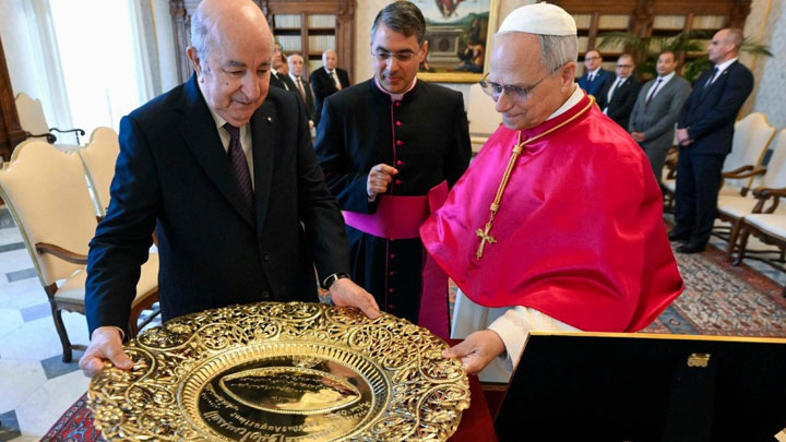 إستقبل البابا لاون الرّابع عشر صباح الخميس في القصر الرّسوليّ، رئيس الجمهوريّة الجزائريّة الدّيمقراطيّة الشّعبيّة عبد المجيد تبون الّذي التقى لاحقًا أمين سرّ دولة حاضرة الفاتيكان الكاردينال بييترو بارولين برفقة وكيل أمانة السّرّ لتعدّديّة الأطراف في قسم العلاقات مع الدّول والمنظّمات الدّولية المطران دانييل باخو.