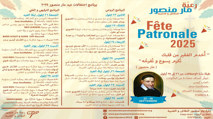 – زيّاح وقدّاس يحتفل به الرّئيس الإقليميّ في رهبنة اللّعازريّة الأب رمزي جريج، يليه حديث عن روحانيّة القدّيس منصور دي بول والدّعوة لعيشها هنا والآن: 6.00 مساءً