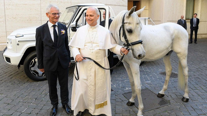 تلقّى البابا لاون الرّابع عشر، على هامش المقابلة العامّة يوم الأربعاء، حصان عربيّ أصيل يُدعى “بروتون”، أبيض اللّون، قدّمه له مؤسّس مزرعة خيول مرموقة في بولندا أندريه ميخالسكي.