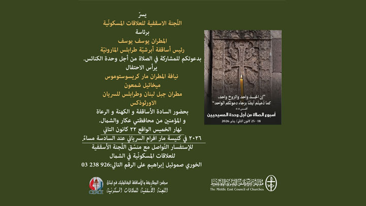 لمناسبة أسبوع الصّلاة من أجل وحدة الكنائس، يترأّس مطران جبل لبنان وطرابلس للسّريان الأرثوذكس مار كريسوستوموس ميخائيل شمعون الصّلاة يوم الخميس 22 ك2/ يناير الجاري، عند السّادسة مساءً، في كنيسة مار أفرام السّريانيّ- شارع مار الياس الميناء- طرابلس.