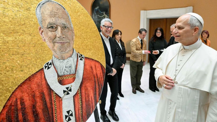 تماشيًا مع التّقليد العريق الّذي يتبع انتخاب كلّ حبر أعظم، تمّ إنجاز “استوديو الفسيفساء” التّابع التابع لمؤسّسة “Fabbrica di San Pietro” اللّوحة الفسيفسائيّة الدّائريّة المهداة للبابا لاون الرّابع عشر.