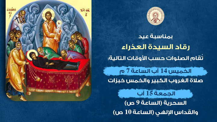 لمناسبة عيد رقاد السّيّدة العذراء، تُقام الصّلوات في مطرانيّة بغداد والكويت وتوابعهما للرّوم الأرثوذكس يومي الخميس والجمعة، بحسب الأوقات التّالية: الخميس: – صلاة الغروب الكبير والخمس خبزات: 7.00 مساءً الجمعة:.