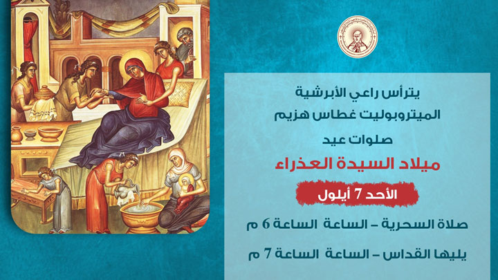 يترأّس راعي أبرشيّة بغداد والكويت وتوابعهما للرّوم المتروبوليت غطّاس هزيم صلوات عيد ميلاد السّيّدة العذراء، يوم الأحد 7 أيلول/ سبتمبر، وتتضمّن: – صلاة السّحريّة: 6.00 مساءً – القدّاس الإلهيّ: 7.00.