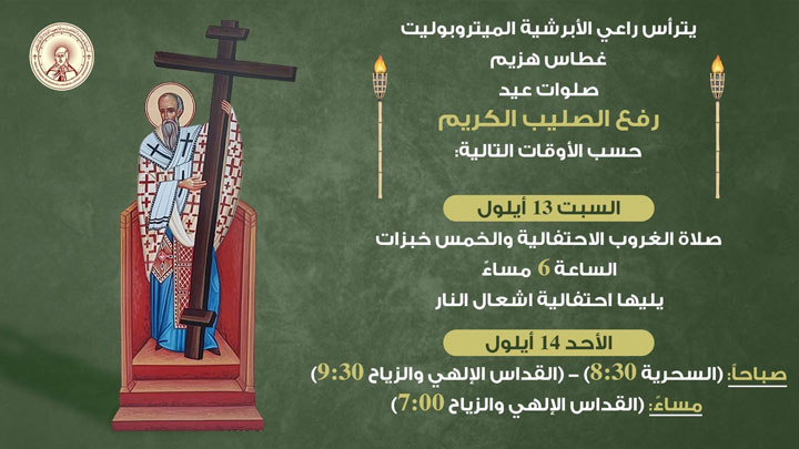 يترأّس راعي أبرشيّة بغداد والكويت وتوابعهما للرّوم الأرثوذكس المتروبوليت غطّاس هزيم صلوات عيد رفع الصّليب الكريم، يومي السّبت والأحد، بحسب الأوقات التّالية: السّبت: – صلاة الغروب الاحتفاليّة والخمس خبزات، يليها.