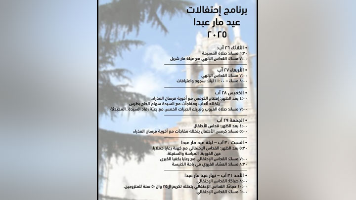 تنطلق اليوم احتفالات عيد مار عبدا في رعيّته في بكفيّا. ويتضمّن البرنامج: الثّلاثاء 26 آب/ أغسطس: – صلاة المسبحة: 6.30 مساءً – القدّاس الإلهيّ مع عيلة مار شربل: 7.00 مساءً.