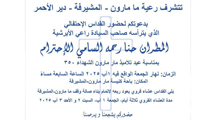 تحيي رعيّة مار مارون- المشيرفة- دير الأحمر، عيد تلاميذ مار مارون الشّهداء الـ350، في قدّاس إلهيّ يترأّسه راعي الأبرشيّة المطران حنّا رحمة. وذلك يوم الجمعة عند السّابعة مساءً، في باحة.
