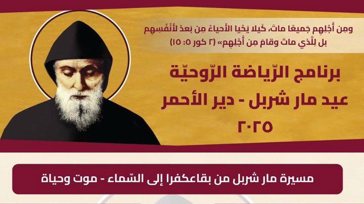 تحت هذا العنوان، تقيم رعيّة دير الأحمر بمناسبة عيد مار شربل رياضة روحيّة، يوميًّا ابتداءً من اليوم الإثنين لغاية الأحد. وفي برنامج الرّياضة: الإثنين: شربل والموت عن العالم – القدّاس.