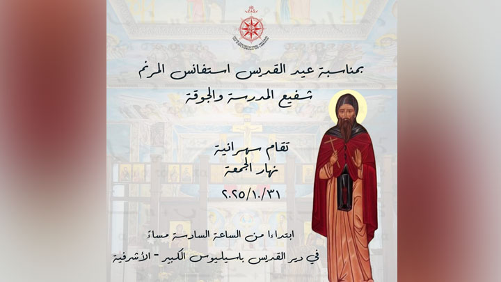 يحتفل دير القدّيس باسيليوس الكبير- الأشرفيّة، مساءً، بعيد القدّيس استفانوس المرنّم. ويقيم للمناسبة سهرانيّة ابتداءً من السّادسة مساءً.