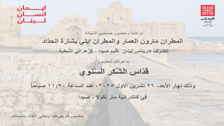 يرفع إقليم كاريتاس صيدا- الزّهراني النّبطيّة الشّكر لله في القدّاس السّنويّ، برعاية وحضور المطرانين مارون العمّار وإيلي بشارة الحدّاد. وذلك يوم الأحد 26 ت/ أكتوبر، عند الحادية عشرة والنّصف صباحًا،.